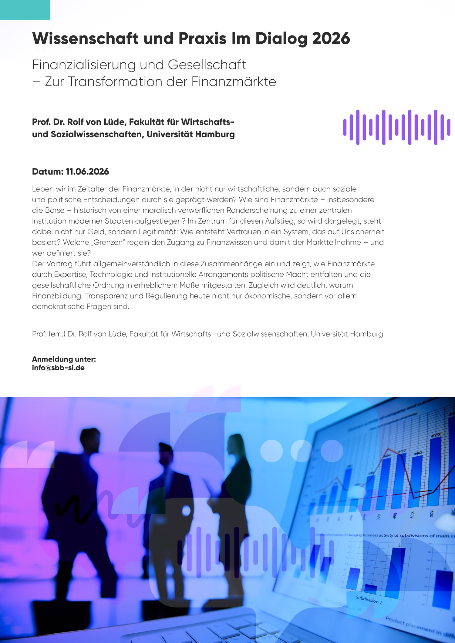 Er wird veranschaulichen, wie Finanzmärkte durch Wissen, Technologie und Regeln unsere Gesellschaft prägen. Er zeigt auf,  warum Themen wie Finanzbildung und Transparenz weit über die Wirtschaft hinausgehen.